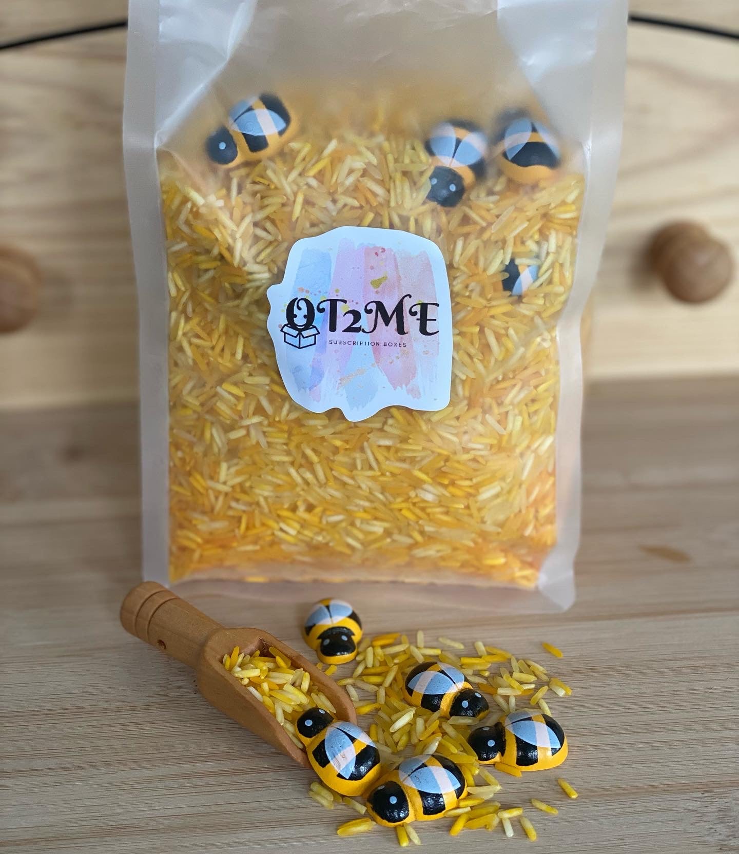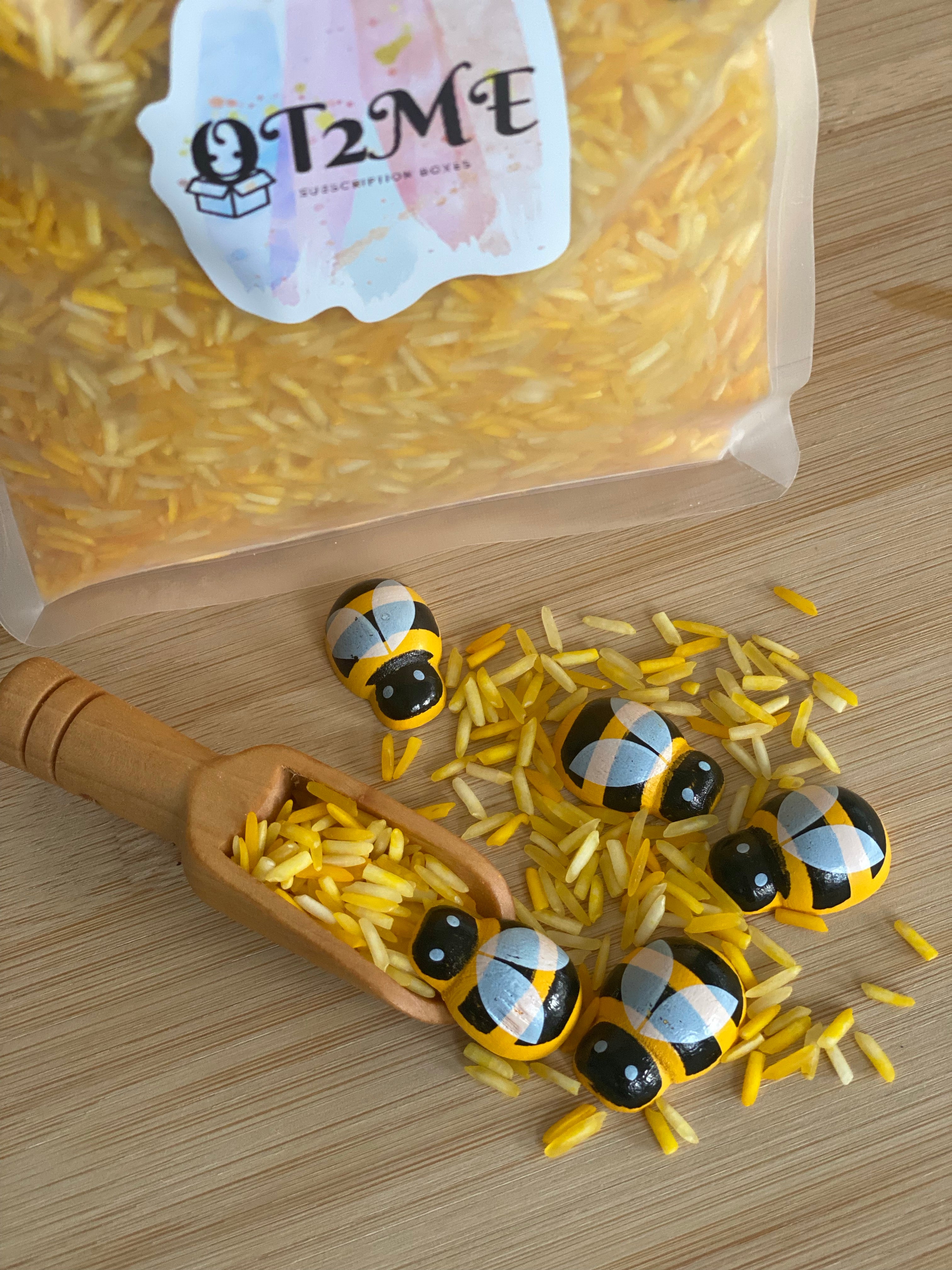 Our Bumble Bee Sensory Rice is the perfect addition to your sensory bin play. All of our rice bags come with a mini wooden scoop which encourages the development of finger strength and dexterity.