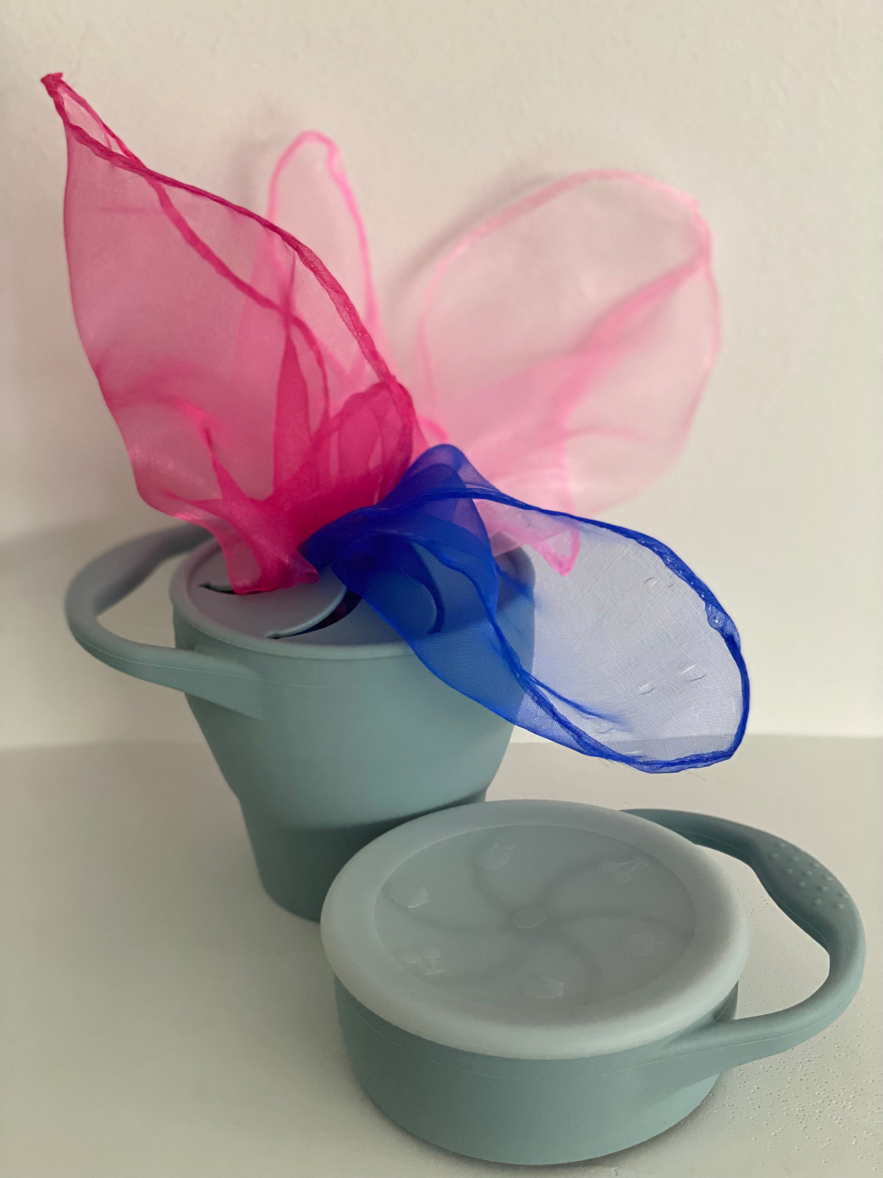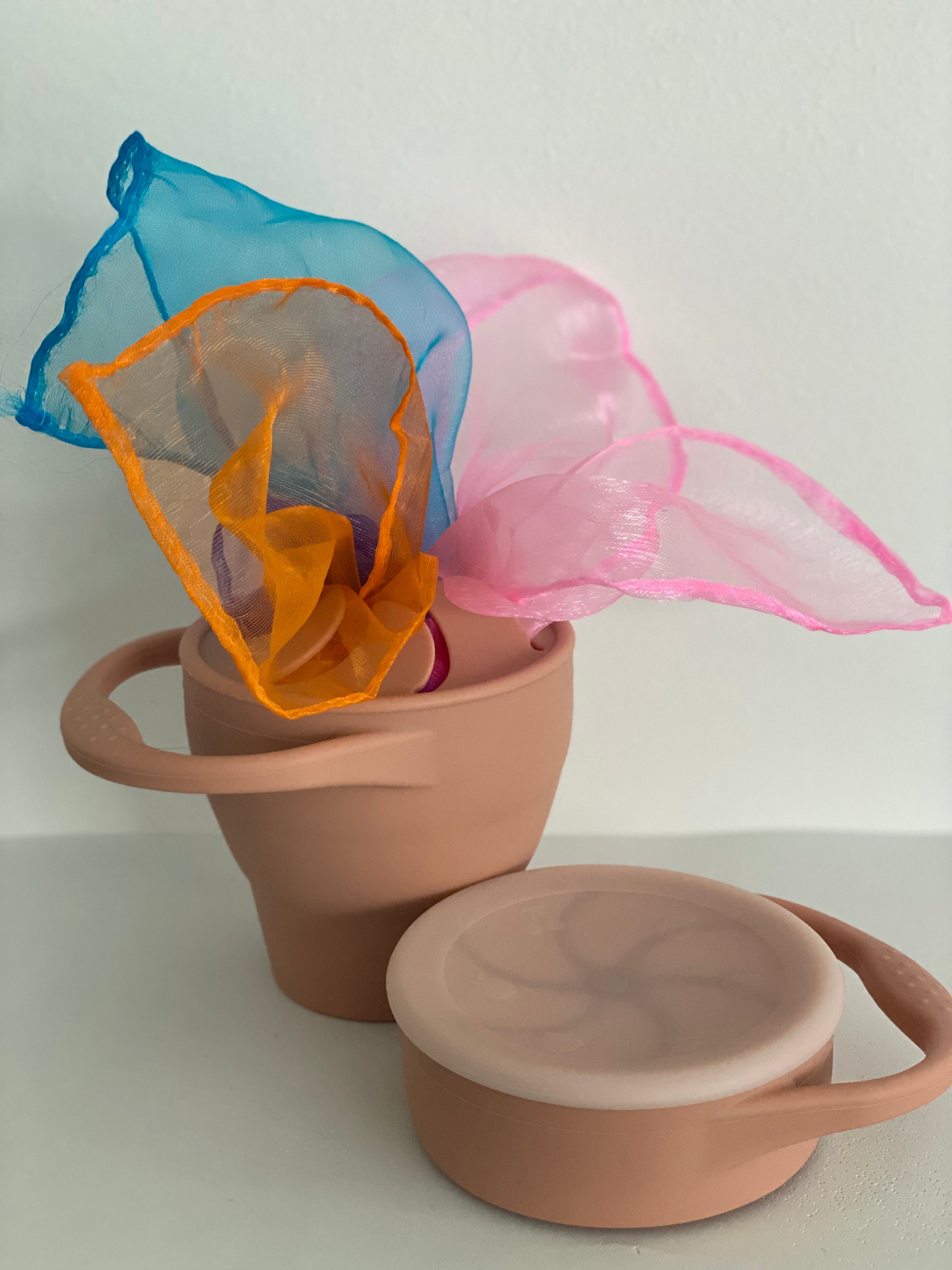 It comes with a set of 3 scarves and a silicon hidy cup! The cup is easy to clean, flexible and soft. Baby can enjoy pulling the scarves out, hiding other toys inside, playing peak-a-boo with the scarves and the cup even doubles as a snack cup with a lid included!