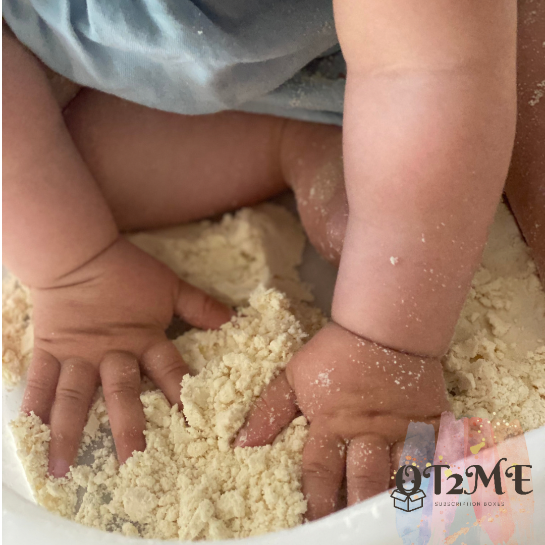 Moon Sand is a soft and fluffy sensory activity for your little one. It is taste safe and has a moldable consistency. Moon sand is one of our introductory sensory bases and is an excellent sensory activity for young explorers.